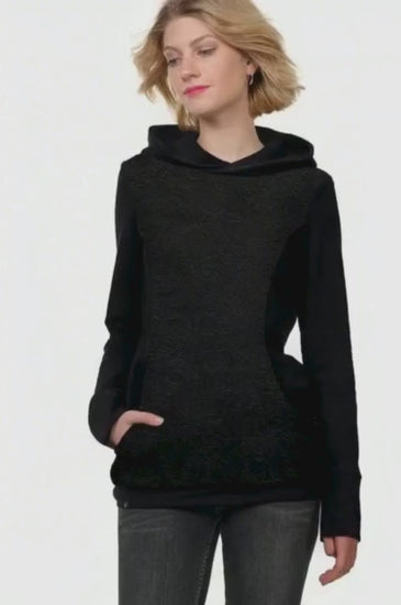 Le sweat à capuche est agréable à porter grâce à sa coupe ample et est douillet et confortable. Il vous réchauffe très bien et est tout simplement fabuleux ! Les empiècements colorés en différents tissus contrastés sur le devant, les poignets, l'empiècement arrière et l'intérieur de la capuche font de ce sweat à capuche un véritable accroche-regard. Les lignes suivent la silhouette féminine, ce qui rend le pull extrêmement flatteur
