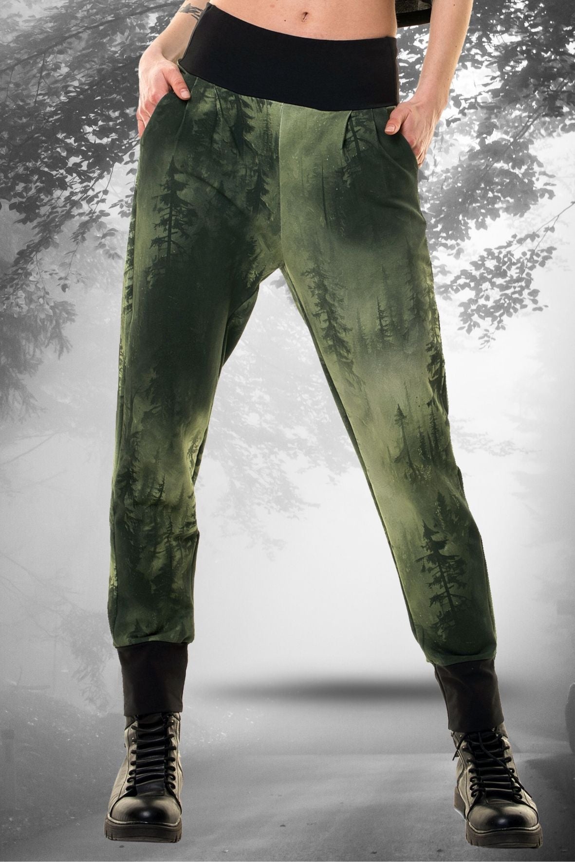 Lass dich verzaubern vom mystischen Nebelwald-Print! Unsere Jersey Hose bringt die Schönheit der Natur direkt zu dir. Der einzigartige Druck und die angenehme Baumwolle machen die Jersey Hose zu einem echten Hingucker. Perfekt für alle Naturliebhaber. Wir lassen unser Eigen Design für dich in Polen produzieren.
